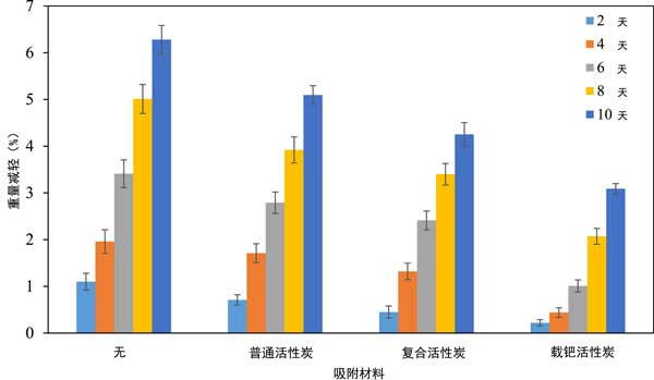 圖3:活性炭材料對貯藏2、4、6、8、10天香蕉失重的影響。