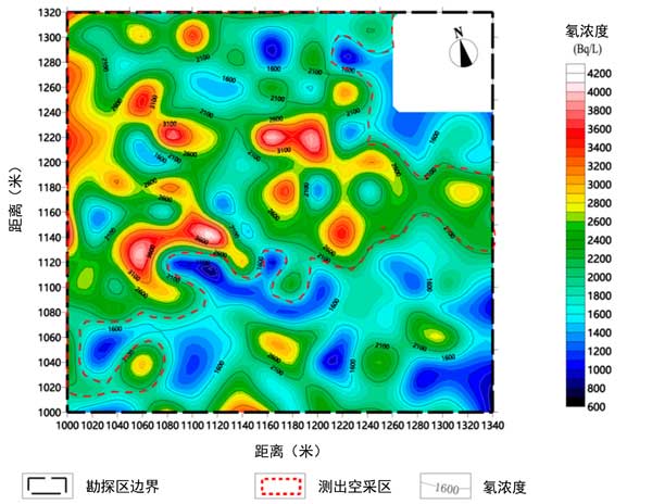 圖2:活性炭測量的氡值等高線平面和采空區異常解釋(紅色線框)圖。