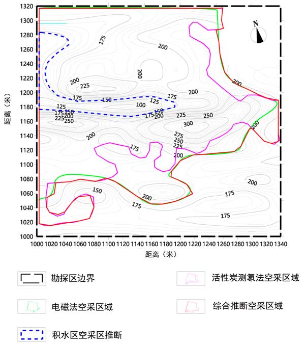 電磁法集探測深度大、分辨率高、能夠識別采空區積水狀態等優點于一體。但是,它很容易受到靜電效應和近場效應的影響。發射端附近的導體可能會對發射源產生干擾,在地形地貌、工作環境復雜的地區極易影響測量精度。然而,用于氡測量的活性炭方法不受地形、地電或EMF的影響。然而,這種方法無法解釋采空區深度。因此,這兩種方法可以相互借鑒,彌補各自的不足。