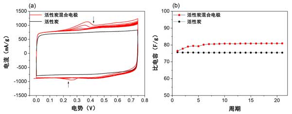 通過評(píng)估電化學(xué)性能,初步測(cè)試了活性炭復(fù)合材料作為混合電極的潛在應(yīng)用。為此,通過將浸泡在1M/H2SO4電解質(zhì)中的隔膜夾在兩個(gè)相同的電極(活性炭或混合材料)之間來組裝對(duì)稱電池。圖3a顯示了活性炭和混合材料在20mV/s恒定掃描速率下的循環(huán)極化(CP)曲線。由于雙電層電容(EDLC)的影響,交流對(duì)稱電池的CP曲線形狀為矩形。另一方面,活性炭混合電極觀察到準(zhǔn)矩形CP曲線NPs對(duì)稱細(xì)胞,具有源自納米銀的各種氧化還原波,與矩形(電容)包絡(luò)重疊。這種CP結(jié)構(gòu)表明法拉第和EDLC兩種電荷存儲(chǔ)機(jī)制的共存。值得注意的是,隨著循環(huán)次數(shù)的增加,觀察到的銀波變得更小并且變得難以察覺,這表明存在一定程度的不穩(wěn)定,正如對(duì)游離多金屬氧酸鹽納米銀所觀察到的那樣。白銀波浪的減少之間存在相關(guān)性(圖3a)在前幾個(gè)周期內(nèi),根據(jù)CP面積計(jì)算出的比電容有所增加(圖3b)。這可以通過氧化銀薄層與銀的比電容差異來解釋。盡管如此活性炭混合電極的比電容略高于裸活性炭電極,活性炭的比電容為75F/g,活性炭混合電極在20次循環(huán)后達(dá)到81F/g。該結(jié)果表明,混合材料具有電活性,并且在對(duì)稱超級(jí)電容器配置中超過了一定程度的交流電。活性炭和混合電極電池的比電容隨著電流密度的增加而降低。對(duì)于活性炭混合材料在掃描速率為2mV/s時(shí)最高值為83.5F/g,在掃描速率為50mV/s時(shí)進(jìn)一步下降至77.5F/g。高掃描速率下比電容的降低歸因于電解質(zhì)離子的低擴(kuò)散。由于時(shí)間限制,高倍率充放電過程中電解液中的離子運(yùn)動(dòng)始終受到擴(kuò)散限制,僅利用外層活性表面進(jìn)行電荷存儲(chǔ)。減慢掃描速率可以讓電解質(zhì)更徹底地滲透到孔隙中,并與電極材料的內(nèi)表面有更多的接觸,從而導(dǎo)致電極表面存儲(chǔ)更多的電荷(更大的電容)。