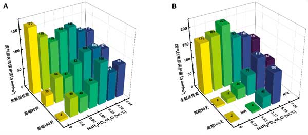 用磷酸三鈉12水合物(Na3PO4·12H2O)在活性炭上進行類似的實驗,活性炭失活后干燥。實驗在11.03wt.%的濃度下進行,相當于4.00wt.%的NaH2PO4·H2O的摩爾當量。很明顯,磷酸三鈉在抑制衰老方面并不有效。經過3個月的加速失活,保護值甚至低于未改性的活性炭。然而,Na3PO4·12H2的效率可能會降低如果在酸性環境中或與酸或酸性化合物一起添加,效果會更好。這是因為酸性條件可以向磷酸鹽提供質子,導致磷酸鈉有效地充當Na2HPO4或NaH2PO4。總體而言,結果表明,在由磷酸及其三種鈉鹽組成的磷酸鹽添加劑中,一元鹽NaH2PO4·H2O是抑制失活最有效的添加劑。