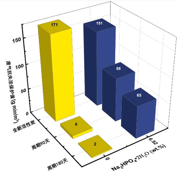 使用Na2HPO4·2H2O添加劑的實驗在6.52%的濃度下進行,其摩爾當量相當于5.15%的NaH2PO4·H2O濃度。圖3的結果表明,Na2HPO4·2H2O添加劑也能有效防止失活,但不如NaH2PO4·H2O有效。例如,失活180天后,防護值含有Na2HPO4·2H2O添加劑的活性炭濃度下降至65mg/min/m3相比之下,使用NaH2PO4·H2O添加劑的活性炭為107mg/min/m3。