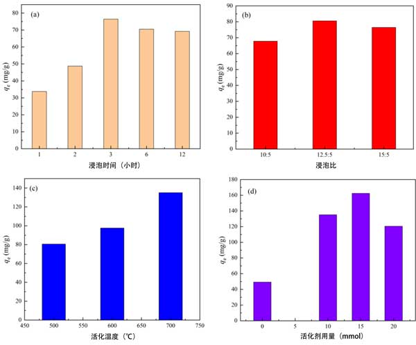 圖2:不同制備條件下改性活性炭對La3+的吸附性能。(a)浸泡時間;(b)浸泡比例;(c)活化溫度;(d)Na2EDTA用量。