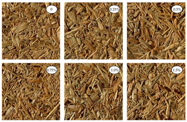 在UF樹脂中添加活性炭還可以改善刨花板的各種機械性能。研究表明,活性炭可以提高板材的尺寸穩(wěn)定性、強度和防水性。這在擔心潮濕暴露的應用中尤其有益。所生產的刨花板的外觀如圖2所示。添加高達1.5%活性炭沒有觀察到任何影響。相反,在碳含量較高的情況下,所得板材變暗并變灰。因此,在不影響材料美觀的情況下,這可以被視為較小負載的優(yōu)勢。