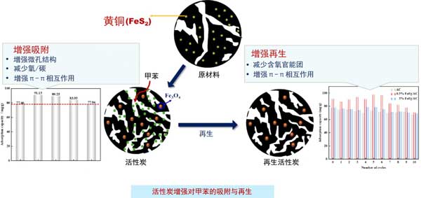 研究發(fā)現(xiàn),添加0.5%的黃鐵礦能顯著提升活性炭的甲苯吸附能力和再生穩(wěn)定性。與未改性活性炭相比,改性后的活性炭甲苯吸附容量增加了17.64%,且在五個再生循環(huán)后仍能保持超過77.59%的初始吸附容量。