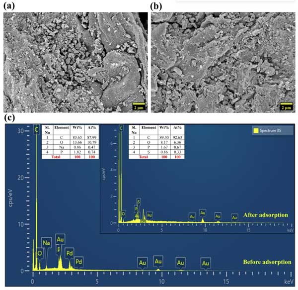 FESEM圖像對吸附前后活性炭的形態變化提供了詳細的視覺分析。吸附前圖像(圖1a)揭示了高度不規則和粗糙的表面形態,其特征是木質纖維素材料的多孔和片狀結構。大型裂紋,空隙和顆粒狀碎屑很普遍,所有這些都導致了高表面粗糙度,并增強了可用的表面積以吸附。此外,發達的孔隙的存在證實了正磷酸激活在建立層次多孔網絡中的有效性,非常適合染料擴散;钚蕴勘砻嬖谖胶蠼洑v了顯著的形態轉化(圖1b)。最初粗糙和不規則的質地變得更加順暢,表明剛果紅分子的成功粘附。裂紋,空隙和孔隙開口的可見性降低,進一步支持了這種轉變。進行EDS以分析活性炭的元素性質(圖1C)。吸附之前,活性炭表現出C和O的主要峰,這確定了活性炭的形成。另外,在正磷酸激活期間引入的磷最初以痕量量存在。