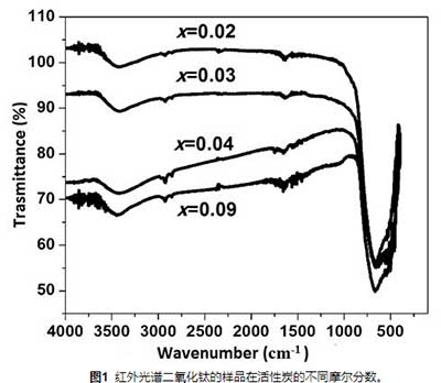圖1示出了TiO 2的樣品的紅外光譜在活性炭的不同摩爾分數。對于浸軟的手動獲得的化合物,譜圖顯示在3440cm -1處的譜帶,這與H-OH振動模式應力相關聯,并且透射率或紅外吸收碳隨著濃度的降低而增加。由于活性炭的存在,在2908cm -1處發現了由于芳香族基團的CH鍵而形成的譜帶,觀察到該譜帶通過降低碳含量而急劇下降。1630cm -1處的帶對應于水彎曲模式。具體看1000到400厘米-1寬帶被定義為活性碳含量增加。該區域的特征譜帶位于680 cm -1處,可與官能團Ti-O-Ti和官能團Ti-O的振動模式相關聯。通常,在圖1中觀察到強度隨著活性炭含量的降低而增加,這表明在低的碳摩爾分數下各種結合的形成更強。