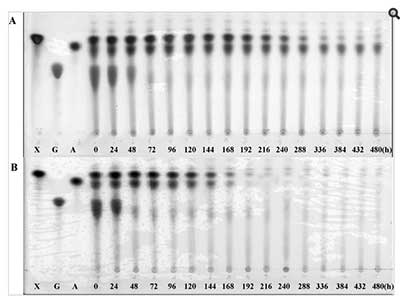 圖3、嗜熱脂肪芽孢桿菌的燒瓶培養肉湯的TLC分析。G,A和X分別表示葡萄糖,阿拉伯糖和木糖標準品。