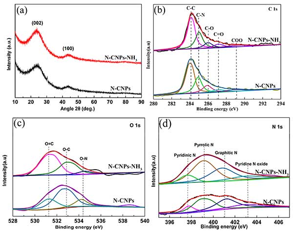 圖2.(a)活性炭和氨活化的活性炭樣品的XRD圖譜。高分辨率的XPS光譜。(b)C 1s(c)O 1s 和(d)活性炭和氨活化的活性炭的N1s帶。