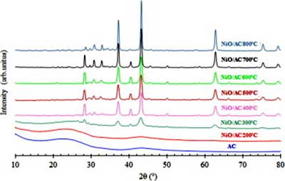 由活性炭和活性炭負載的鎳在不同的熱處理溫度下記錄的X射線衍射圖如圖1 所示。在200中被加熱的樣品 ℃,在2θ顯示有2個衍射峰 = 23.5和43.5°,對應于(0 0 2),(1 0 無定形活性炭0)指數平面。另外,隨著煅燒溫度從300 ℃ 升高到800 ℃ ,反射次數增加,表明添加的催化劑在2θ = 37.1°,43.2°,62.7°和75.3° 處被氧化成氧化鎳 。這些角度分配給(1 1 1),(2 0 0),(2 2 0)和(3 1 1)面,立方晶體的氧化鎳。此外,對于400-800 ℃ 煅燒的樣品,在對應于(2 2 2)的2θ = 79.3° 處觀察到新的峰。氧化鎳峰的強度也隨著煅燒溫度的增加而增加。