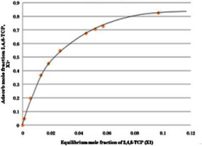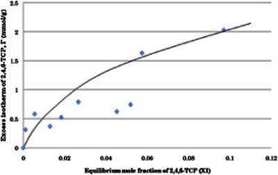 從過量的吸附數據中,吸附平衡曲線繪制在y軸上的過量等溫線和在x軸上的平衡摩爾分數如圖1所示。圖1顯示 了在整個濃度范圍內,在30 ℃的恒溫下2,4,6-TCP在活性碳上的過量等溫線。從圖1可以看出,混合物中沒有發生負吸附。從圖1還可以觀察到2,4,6-TCP在活性炭上的吸附隨著2,4,6-TCP濃度的增加而增加。