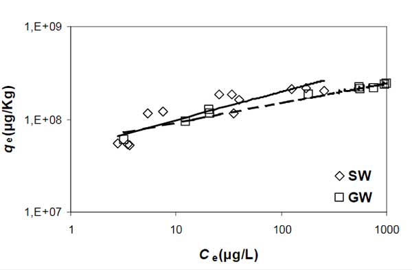 圖1:活性炭吸附菲等溫線(qe:每單位質量固體吸附的溶質質量,Ce:平衡溶質濃度; FW:淡水; SW:鹽水)。