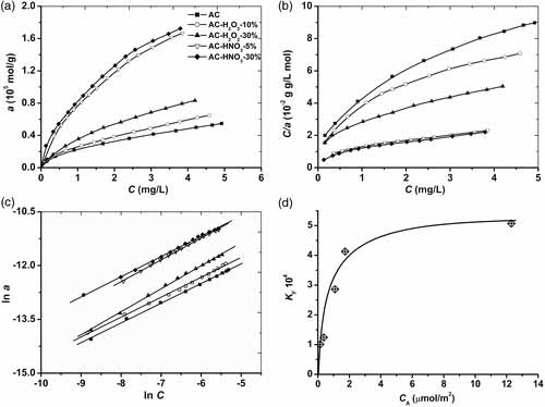 關于活性炭改性后吸附銅離子上的平衡研究的實驗數據繪制在圖2(a)中。該圖顯示最有效的吸附劑是活性炭-HNO 3-5和活性炭-HNO 3-30樣品,去除率R超過50%。在低濃度Cu 2+的范圍內,低于1.5×10-4 M,R的值高于80%。我們認為,這是由于含氧基團的高濃度。