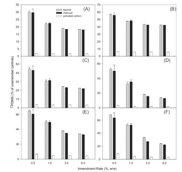 在平衡時(shí),通過活性炭吸附或隔離PBDEs反映了它們?cè)赑DMS纖維(C PDMS)上檢測(cè)到的水平的變化。在JL沉積物中,隨著活性炭修正,C PDMS顯著下降,并且活性炭的類型之間的減少不同(圖2)。例如,當(dāng)用生物炭以0.5%修正JL沉積物時(shí),C PDMS降低至未沉降沉積物中的水平的30.0-67.8%。木炭(29.7-63.5%)的效果與生物炭相似(圖2)。相比之下,活性炭修正沉積物中C PDMS的下降幅度更大(圖2))。例如,在含有0.5%活性炭的JL沉淀物中,對(duì)于不同的同源物,C PDMS降低至未改良處理的水平的1.8-8.1%。平均而言,添加1.0%的活性炭導(dǎo)致所選BDE同系物的C PDMS降低至對(duì)照水平的1.7-5.9%,這表明活性炭在沉積物中螯合PBDEs的能力遠(yuǎn)遠(yuǎn)高于其他黑碳材料。