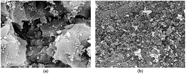 圖1:在3000×放大倍數(shù)下的SEM照片:(a)未經(jīng)預(yù)處理的活性炭,(b)微波處理的活性炭。