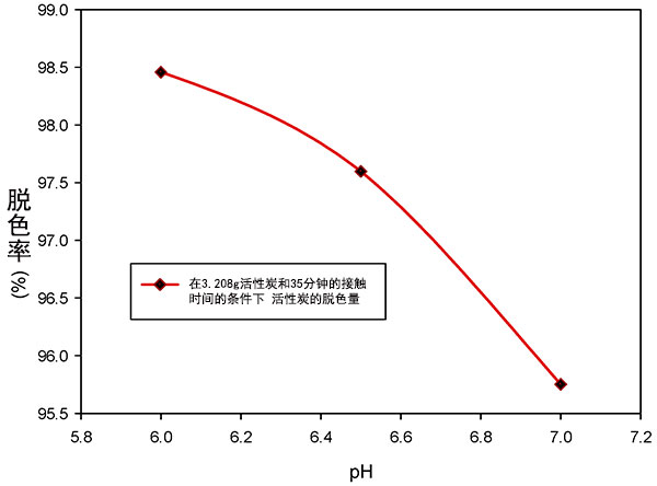 實(shí)驗(yàn)過程中發(fā)現(xiàn),活性炭在較低的pH環(huán)境對(duì)顏色吸附效果得到大幅度增強(qiáng)。盡管如此,排放處理的酸性廢水的影響可能直接阻礙水生棲息地。鑒于此,使用預(yù)處理的活性炭吸附研究在6至7的可接受的pH范圍內(nèi)進(jìn)行。考慮的另外兩個(gè)因素是劑量和接觸時(shí)間,并且它們分別保持在3.208g和35min。從圖3中可以看出可以觀察到,顏色去除的百分比隨著pH的降低而增加。在pH6時(shí)獲得最高的顏色去除率98.46%,但隨著pH增加到7,顏色去除率降低到95.69%。