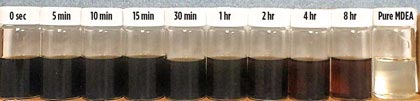 圖4顯示與含有含有活性炭8小時的MDEA的小瓶相比,不含活性炭的受污染的MDEA的顯著顏色變化。這很可能是因為活性炭吸附了雜質(zhì)并澄清了MDEA溶液。還觀察到粘度變化但未測量。