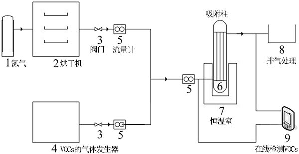 在吸附柱中研究了活性炭吸附甲苯的能力。活性炭的用量為10g,吸附質甲苯氣體由氣體發生器產生。通過測定吸附前后甲苯的濃度,得到了不同條件下活性炭吸附性能的數據。實驗吸附裝置的流程圖如圖2所示。將來自氣體發生器的甲苯氣體與氮氣混合,然后將其吸附在恒溫吸附塔中。通過在線FID檢測器測量吸附前后的甲苯含量,并通過流量計控制甲苯流量。當脫氣和入口濃度在30分鐘內保持一致時,認為已達到吸附平衡。吸附氣體通過廢氣出口排空。