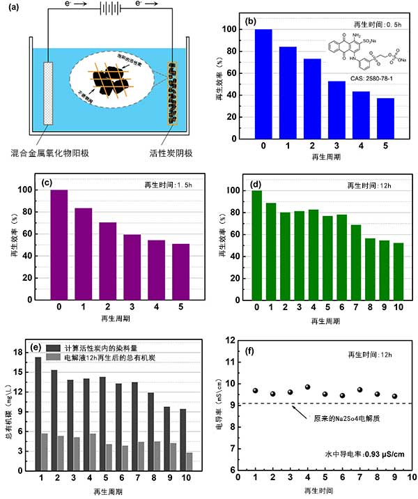 圖1。再生時間對RE和總有機碳(TOC)去除的影響。(a)設置示意圖。(b)-(d)當再生時間分別為0.5小時(b),1.5小時(c)和12小時(d)時,RE的變化。(e)再生12小時后的電解質TOC,并計算吸附在活性炭上的RB19的TOC。(f)12小時后電解質的電導率超過10次再生。