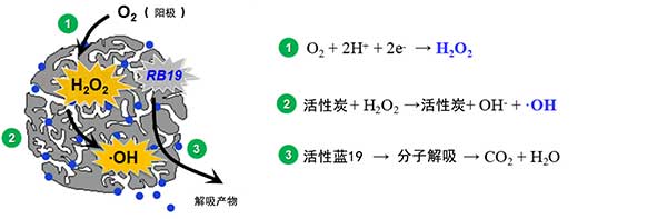基于該結果,提出了活性炭電化學再生的機制(圖2)。O 2在混合金屬氧化物陽極上產生并輸送到陰極附近。陰極,使用由RB19加載活性炭由不銹鋼網緊緊包裹的,電還原Ò 2至過氧化氫二者上活性炭表面和多孔結構內。由于活性炭的催化能力,過氧化氫的孔隙內和表面活性炭被激活,以形成高氧化性OH,負責RB19及其降解中間體的裂解,導致活性炭再生和TOC去除。由于陰極附近的pH增加,孔內的RB19也可能從活性炭內解吸。