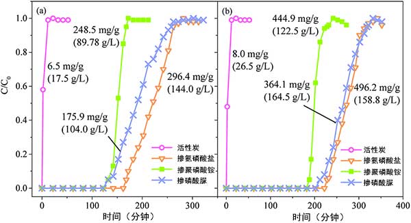 活性炭對甲苯的穿透曲線以及吸附容量如圖2所示。沒摻氮的活性炭表現出較差的甲苯吸附性能,吸附容量分別為6.5和8.0mg g-1。與摻氮活性炭相比,添加含氮磷酸鹽的活性炭需要更長的時間才能接近突破并表現出更高的吸附能力。對于在600℃下制備的活性炭,其經含氮磷酸鹽處理的活性炭的突破時間為氨磷酸鹽活性炭>磷酸脲活性炭>聚磷酸銨活性炭,其相應的體積吸附容量為144.0,104.0和89.8g L-1,質量吸附容量分別為296.4,175.9和245.8 mg g-1,分別。與600℃相比,900℃制備的活性炭具有更高的甲苯吸收量,體積吸附容量為122.5-164.5g L -1,質量吸附容量為364.1~496.2 mg g-1。值得注意的是,可以看出氨磷酸鹽處理的活性炭具有較高的質量吸附能力,而磷酸脲處理的活性炭具有較高的體積吸附能力。這可能歸因于它們不同的堆積密度,氨磷酸鹽具有比磷酸脲更高的堆積密度。