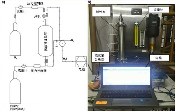 在設(shè)計(jì)為0.3米長(zhǎng)的實(shí)驗(yàn)室規(guī)模的單吸附塔單元中檢查六種活性炭對(duì)硫化氫的吸附性能。每種活性炭的高度指的是不同的活性炭載荷,分別為0.032kg,0.105kg和0.155kg。通過單次進(jìn)料H 2 S/N 2(1000 ppm H 2 S余量N 2)或H 2 S/N 2/CO 2(1000 ppm H 2)的混合氣體觀察吸附性能。圖1(A)和圖1(B)分別顯示了硫化氫吸附系統(tǒng)的示意圖和實(shí)際照片。