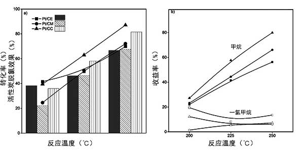 圖3:二氯甲烷(a)的初始轉化率和脫氯以及活性炭載鉑催化劑對甲烷和一氯甲烷(b)的收益率。