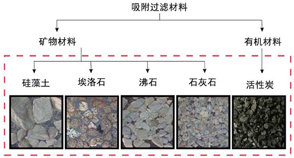 在分析中使用活性炭和未經(jīng)修飾的礦物材料,例如沸石,石灰石砂,硅藻土和埃洛石(圖1)。礦物材料是不經(jīng)受預(yù)處理,以確保使用最經(jīng)濟(jì)上有利的材料。本期使用的活性炭是一種微孔材料,由微孔表面和體積值和相對較低的中孔表面值證明該材料的表面。硅藻土,沸石和埃洛石是中孔材料,因此其特征在于具有中間孔的平均比表面積,所述中孔具有不規(guī)則尺寸和形狀的窄裂縫形狀。在埃洛石中觀察到這些礦物中介孔的大比表面積和體積,而硅藻土的孔隙比較少,石灰石砂可歸類為無孔材料。