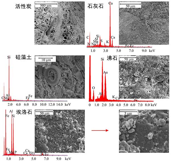 掃描電子顯微鏡(SEM)圖像和反應(yīng)材料的化學(xué)微范圍分析(EDS)如圖2所示。值得注意的是,活性炭樣品具有大膨脹的多孔表面,內(nèi)部孔隙的尺寸達(dá)到十幾微米到幾百微米。石灰石砂的SEM分析證實(shí)了這種材料的碳酸鹽特征,而鈣和氧的微區(qū)化學(xué)分析指向方解石(CaCO 3))。SEM-EDS分析表明硅藻土樣品中存在來自二氧化硅基團(tuán)的礦物,并允許將該材料的巖相分類為硅藻土。SEM微圖像證實(shí)了中等發(fā)展的沸石和埃洛石的表面,并且在后一種材料的情況下,存在特征性的納米管,然而,在該放大率下不是非常明顯。此外,EDS光譜指出沸石樣品中存在:硅(Si),氧(O),鋁(Al),鉀(K),鈣(Ca)和鐵(Fe),以及:鐵(Fe) ,埃洛石樣品中的鋁(Al),硅(Si),鎂(Mg),磷(P),鈣(Ca)和鈦(Ti)。
