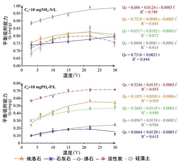 銨和磷酸根離子的平衡試驗(yàn)僅在3℃至22℃的溫度范圍內(nèi)進(jìn)行,因此,吸附容量和溫度的關(guān)系沒有用多項(xiàng)式函數(shù)描述。類似地,如在系列I的分析中,活性炭對除去銨離子效果比較好,在磷酸鹽的情況下,具有高去除能力的材料是活性炭。