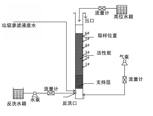 活性炭反應(yīng)器工藝流程圖如圖1所示。活性炭池由有機(jī)玻璃制成,有機(jī)玻璃是柱式反應(yīng)器。活性炭池高度為2米。內(nèi)徑為63毫米。填充高度為1800毫米。碳層高度為1500毫米。砂濾器高度為300毫米。反應(yīng)體積為4.7 L.有5個水取樣口和碳池。底部有曝氣器,碳池頂部有溢流堰。水質(zhì)分析指標(biāo)為紫外分光光度法和紫外分光光度計。