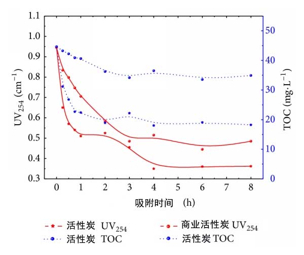 根據(jù)圖4,活性炭表現(xiàn)出良好的吸附生化水的性質(zhì)。UV254和TOC的濃度具有類似的變化趨勢。UV254和TOC的去除效率分別為63.0%和59.7%。商業(yè)活性炭的吸附性能較弱。UV254和TOC的去除率僅為52.9%和24.8%。商業(yè)活性炭的孔體積小于活性炭的孔體積。圖4中活性炭的UV254去除曲線分為兩個階段,它們分別對應(yīng)于膜擴(kuò)散和粒子擴(kuò)散。