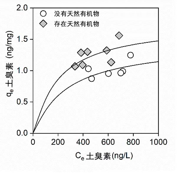吸附平衡實驗進行60分鐘,這足以根據動力學研究達到吸附平衡。圖3顯示了在不存在和存在天然有機物質的情況下土臭素在活性炭上的吸附等溫線。如圖2所示,在天然有機物質存在下,吸附的土臭素的總量增加。這些結果意味著天然有機物質可以增加活性炭的吸附位點。帶負電荷的天然有機物質增加,因為電排斥力,從而增加了活性炭吸附能力。