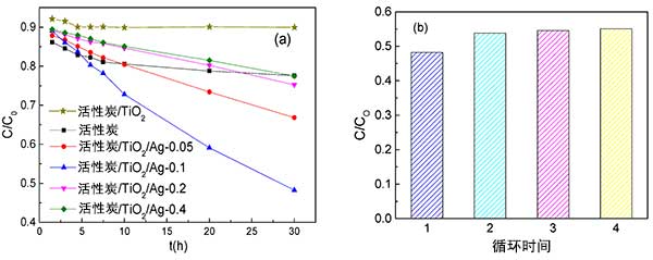 通過在活性炭表面上加載銀離子和二氧化鈦,成功地制備了具有自再生性能的活性炭。將銀離子均勻地固定在活性炭纖維上并用二氧化鈦包覆。這種結構有效地避免了銀離子的聚集和剝落。隨著含銀量的增加,銀離子的尺寸和含量增加,而活性炭的孔體積減小。經過實驗發現用0.1mol/L AgNO 3溶液制備的活性炭表現出較好的自再生性能和耐久性。活性炭保留的豐富孔隙增加了二氧化鈦周圍的亞甲基藍濃度和促進其光降解。同時,活性炭合適的銀含量增強了光降解性能。