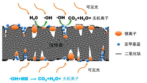 通過光催化降解再生活性炭具有很大的優勢,因為與其他再生工藝如熱和化學處理,微生物再生,電化學方法和超臨界萃取相比,它具有成本低,二次污染少的特點。此外,光催化再生可以通過同時進行光催化降解和吸附來實現活性炭的自再生。二氧化鈦(TiO 2)是一種高效的光催化劑,通常固定在活性炭上進行再生。然而,TiO 2的光催化降解部分受到限制,因為它具有兩個固有特性:(1)具有大的帶隙,TiO 2僅吸收UV光子,其僅占太陽光譜中能量的約5% ,(2)由于電荷載體的快速復合,TiO 2具有低的光催化活性。為了延長光響應區域,貴金屬被摻入TiO 2中,包括金,銀和鉑。與金和鉑相比銀具有抗菌活性和低成本,因此具有更廣泛的應用領域。
