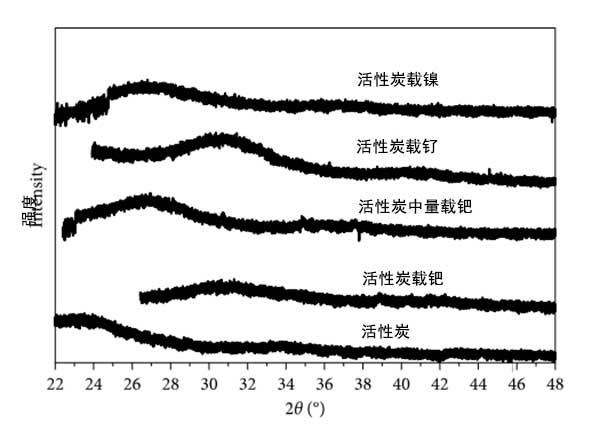 活性炭載三種金屬的衍射圖如圖2所示。在該圖中,可以看出金屬樣品或活性炭沒有確定的信號,這可能表明所有樣品中都沒有結(jié)晶相,或晶體非常小(<100)。不存在結(jié)晶是由于樣品的低金屬負載量低于X射線衍射設備的檢測極限的結(jié)果。