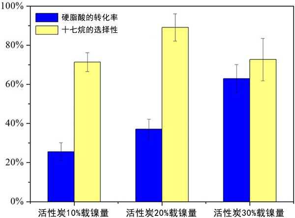 在相同的實驗條件下在三種活性炭載鎳催化劑上檢測硬脂酸的脫羧作用,其中鎳負載量不同(10%,20%和30%);钚蕴康逆囏撦d對硬脂酸轉化率和十七烷選擇性的影響如圖2所示。從圖中可以看出,硬脂酸的轉化率隨著活性炭上鎳負載量的增加而增加。十七烷的選擇性超過20%載鎳量的活性炭遠高于10%和30%載鎳量的活性炭。經過活性炭催化后得到產物除十七烷外,還檢測到其他產物如癸烷,十一烷,十二烷,十三烷,十四烷,十五烷,十六烷,十七烷,十八烷和十八烷醇。