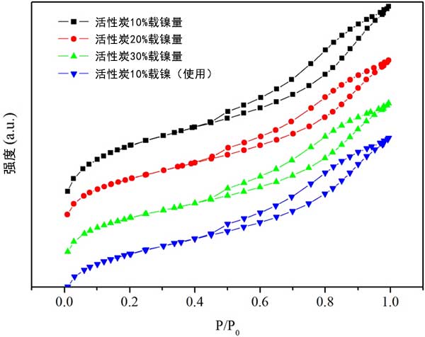 為了研究活性炭載鎳催化劑的可重復使用性,首先在真空下過濾分離先前實驗的廢活性炭,然后用丙酮徹底洗滌,接著用水洗滌多次。然后將過濾的活性炭在強制通風烘箱中在110℃下干燥,然后在管式爐中在氮氣流下在500℃下煅燒4小時。經過從新活化的活性炭的測試,活性炭對硬脂酸的產率和選擇性轉化為十七烷在重復三次催化后性能幾乎沒有下降。選擇性保持在約90%,在無溶劑體系中保持穩定;钚蕴康腘2吸附-脫附等溫線如圖3所示,表明隨著鎳負載量的增加,活性炭的表面積和孔體積減小,表明過量的鎳顆?赡茏枞欢康幕钚蕴靠撞p少孔體積。