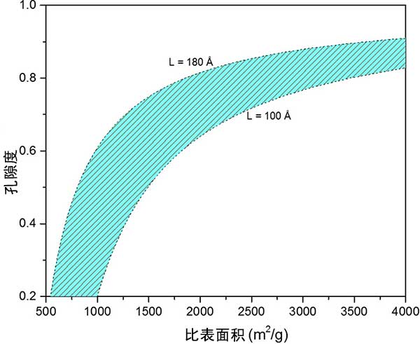 以前提出的活性炭微孔率模型將表面積和孔隙率作為兩個獨立變量處理。通過將石墨烯片的長度限制在100和180之間,并通過改變石墨中石墨烯層的平均數量,我們計算孔隙率和比表面積之間的關系。圖2顯示了孔隙率和表面積之間的關系。