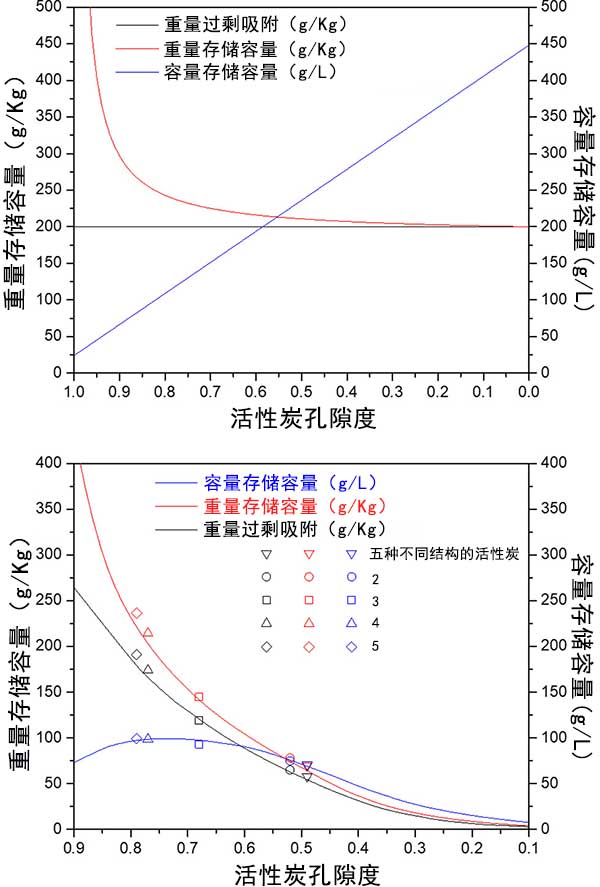 圖4顯示了兩種活性炭的重量和體積存儲容量之間的相互依賴性。實驗吸附測量與第二模型一致,將孔隙率和表面積作為因變量處理。經過對比活性炭樣品的實驗性過量吸附,重量儲存容量和體積儲存容量。圖3和圖4將理論模型與實驗數據進行比較。它表明,所開發的模型是通用的,并預測任何活性炭樣品的重量和體積儲存容量之間的相互依賴性。結果也適用于金屬有機骨架。雖然實驗結果比較好的活性炭不具有較高的表面積,但孔隙率在0.65和0.75之間。通過使用化學粘合劑將活性炭粉末壓縮成整料,實現了更高的體積儲存容量。整體的體積儲存容量使用整體式整體密度而不是活性炭的表觀密度或金屬有機框架材料的單晶密度來計算。