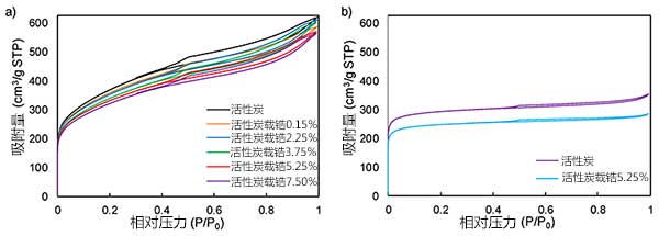 圖1:(a)化學(xué)活性炭在不同鋯負(fù)載之前和之后的-196℃下的氮吸附-解吸等溫線(xiàn)。(b)在鋯載荷為5.25%之前和之后的物理活性炭。