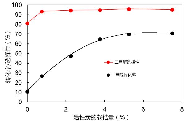圖2:穩(wěn)態(tài)甲醇轉(zhuǎn)化率和對(duì)二甲醚的選擇性活性炭的鋯負(fù)載的變化。