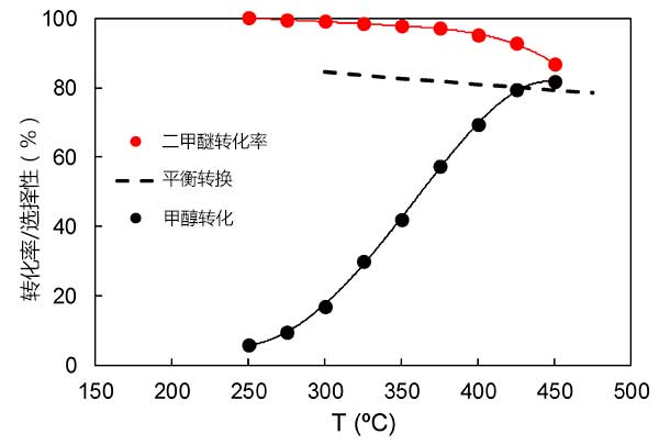 圖3表示甲醇穩(wěn)態(tài)轉(zhuǎn)化率和對(duì)二甲醚的選擇性隨活性炭的反應(yīng)溫度的變化。如所預(yù)期的,反應(yīng)溫度的升高導(dǎo)致甲醇穩(wěn)態(tài)轉(zhuǎn)化率的增加。關(guān)于對(duì)二甲醚的選擇性,必須指出該活性炭催化劑表現(xiàn)出的高值(高于95%),即使在高達(dá)400℃的溫度下也是如此。在高于425℃的溫度下,對(duì)二甲醚的選擇性開(kāi)始下降,并且CH 4和CO作為主要副產(chǎn)物出現(xiàn),這是由甲醇/ 二甲醚分解產(chǎn)生的。