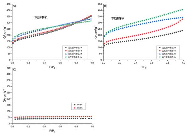 圖1:(A、B)兩種木質(zhì)材料的一階段和兩階段活化(C)原材料碳化的吸附等溫線。