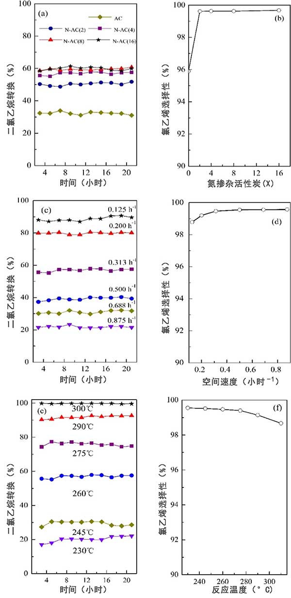 如圖2所示,氮摻雜活性炭顯示低二氯乙烷轉化率(~32%)和96%氯乙烯選擇性。氮摻雜的活性炭催化劑顯著提高了催化活性,具有更高的二氯乙烷轉化率和高于99.5%的氯乙烯單體選擇性。該行為表明氮摻雜活性炭在二氯乙烷催化裂解成氯乙烯單體具有優異的催化性能。圖中a,b顯示了氮摻雜水平對制備的氮摻雜活性炭催化劑性能的影響。c,d顯示了正如預期的那樣,隨著空速的增加,二氯乙烷轉化率下降,而隨著二氯乙烷液時空速的降低,氯乙烯選擇性略有下降。e,f顯示了反應溫度對在氮摻雜活性炭的反應中的影響。該行為表明氮摻雜活性炭在二氯乙烷催化裂解成氯乙烯方面具有優異的催化性能。