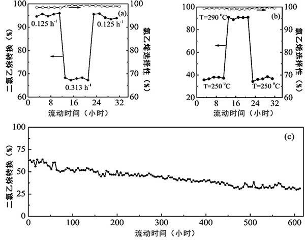 b、顯示出了反應溫度對氮摻雜活性炭中的二氯乙烷液時空速穩定性的影響。氯乙烯選擇性在所有情況下都是相對靜態的,高于99%。