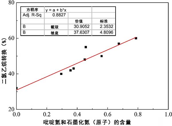 氮摻雜活性炭的活動點如圖3所示,隨著吡啶氮和石墨氮的增加,二氯乙烷轉化率呈線性增加,不論氮資源的變化如何,推斷吡啶氮和石墨氮與二氯乙烷的催化脫氯化氫密切相關,是有效的氮原子。