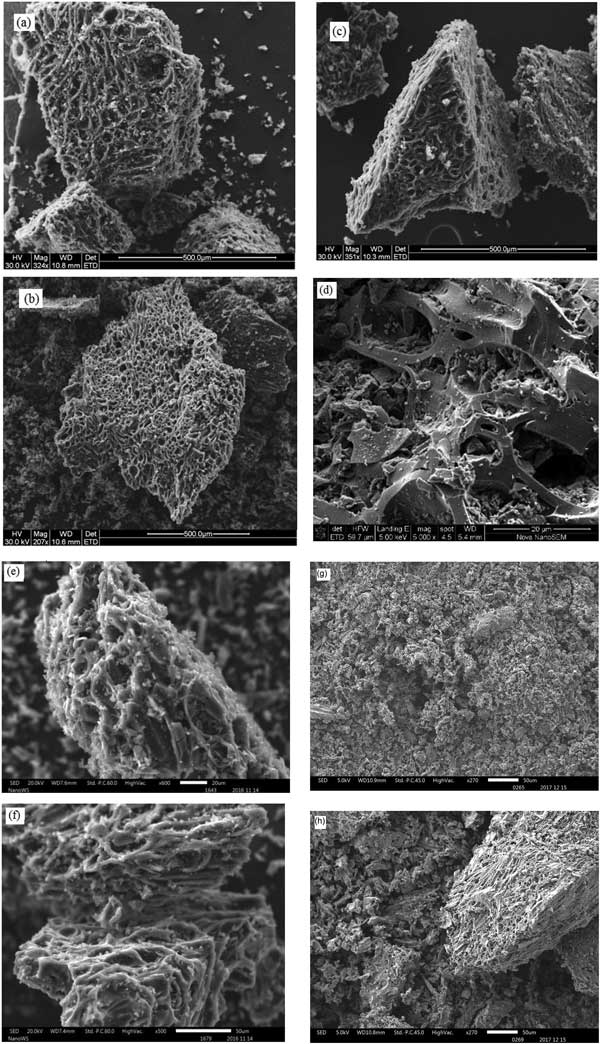 掃描電子顯微鏡圖像顯示在圖1a-h中。活性炭的磷酸處理導致具有可見孔隙率的材料(圖1a-c)。然而,仔細觀察后,孔隙結構和尺寸是不同的。20%濃度改性后的活性炭具有稍微細長的孔,40%表現出均勻的圓形孔,而60%顯示出細長和圓形毛孔的混合。這些觀察結果表明,不同濃度的磷酸活化的活性炭具有不同的物理屬性。在這種情況下,磷酸是活化劑,并且在加熱時產生孔道,因為它從碳中逸出,從而帶走一些萃取劑。圖1d描繪了具有小孔的粗糙紋理,圖1e顯示了類似巢的類型的孔,圖1f顯示了孔的破壞和變寬。孔結構和孔體積的變化可歸因于活化劑的強度增加。濃度較高的硝酸會破壞表面基團。因此,需要使用最佳濃度的活化劑來防止損害吸附劑的表面特性。濃度太高可能導致結合官能團的提取,使吸附劑吸附性差。