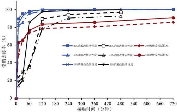 吸附物與活性炭的接觸時間對吸附效果的影響很大,在接觸過程中鉻的去除從0到10分鐘急劇增加,然后從10分鐘減慢到120分鐘,最終在硫酸改性的吸附劑中從120到720分鐘達到平衡。用磷酸改性的吸附劑觀察到相同的趨勢,但是在60分鐘時更早達到平衡,而對于硝酸改性活性炭,平衡似乎在240和480分鐘之間達到。去除百分比沒有明顯差異從120到720分鐘。除了更快的去除動力學之外,磷酸改性的吸附劑顯示出比硫酸和硝酸改性的對應物更高的去除百分比,從0到120分鐘。據預測,無機酸在浸漬過程中會穿透活性炭孔隙,一旦加熱到高溫,它們就會通過孔隙與萃取劑一起逸出,留下互補的孔隙。留下的通道通過與所得官能團的物理和化學相互作用幫助吸收吸附物。出于均勻性原因,選擇12小時并用作后續實驗的最佳時間。