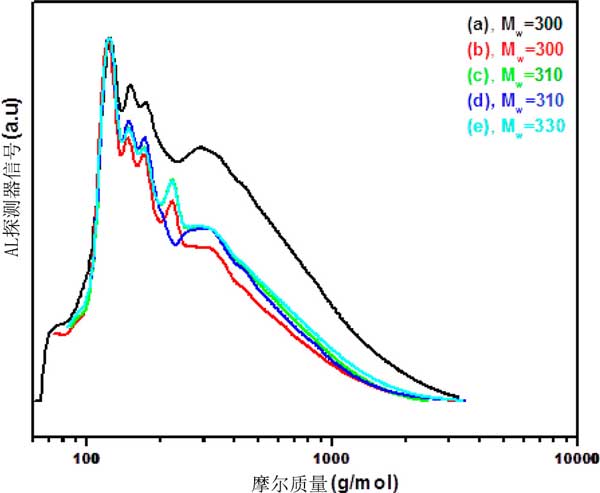 圖2:在400℃下通過各種活性炭載磷化物獲得的木質素油的凝膠滲透色譜圖。